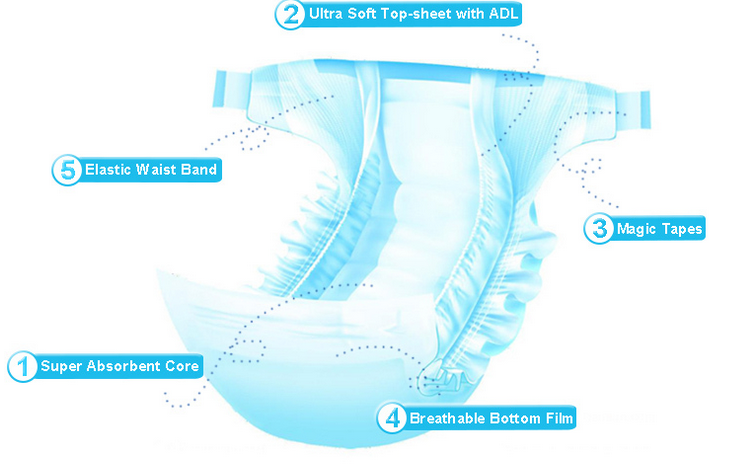 A: We are an ISO, SGS, CE, approved manufacturer specialized in Baby Diaper, Sanitary Napkin, Adult Diaper and other Hygiene Products. OEM & ODM service are available.